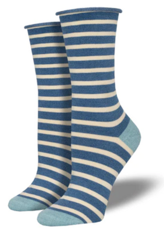 Women's Bamboo Sailor Stripe Roll Top Crew Sock -Blue Heather
